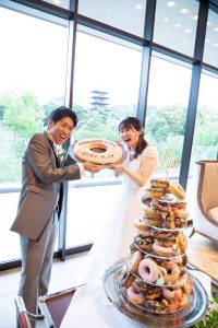 ふたりの好きを飾られているだけでも素敵ですが、ファーストバイトでおふたりがドーナツを頬張る姿にゲストもほっこり!