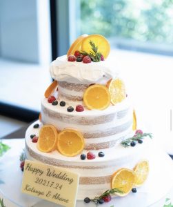 一般的なウエディングケーキと違い、全面にクリームを塗らないのが特徴。