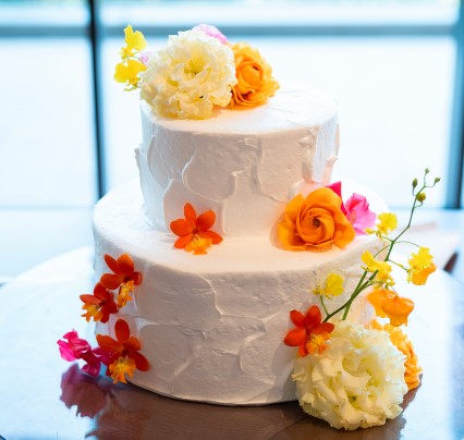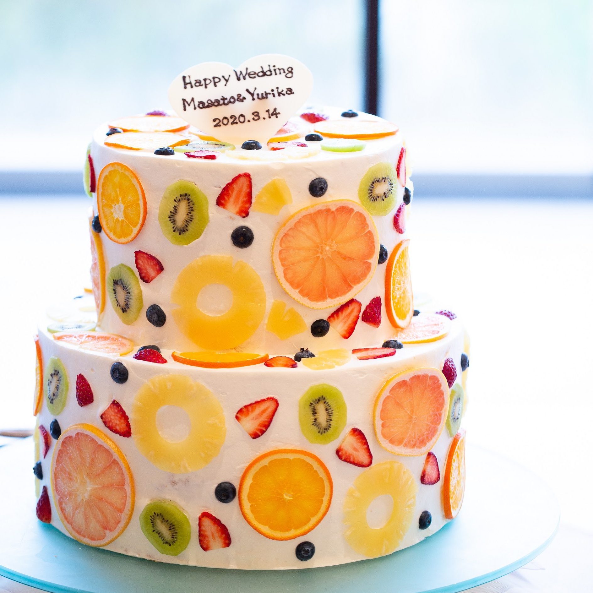 フルーツの断面を並べてカラフルでキュートに仕上げたウエディングケーキ