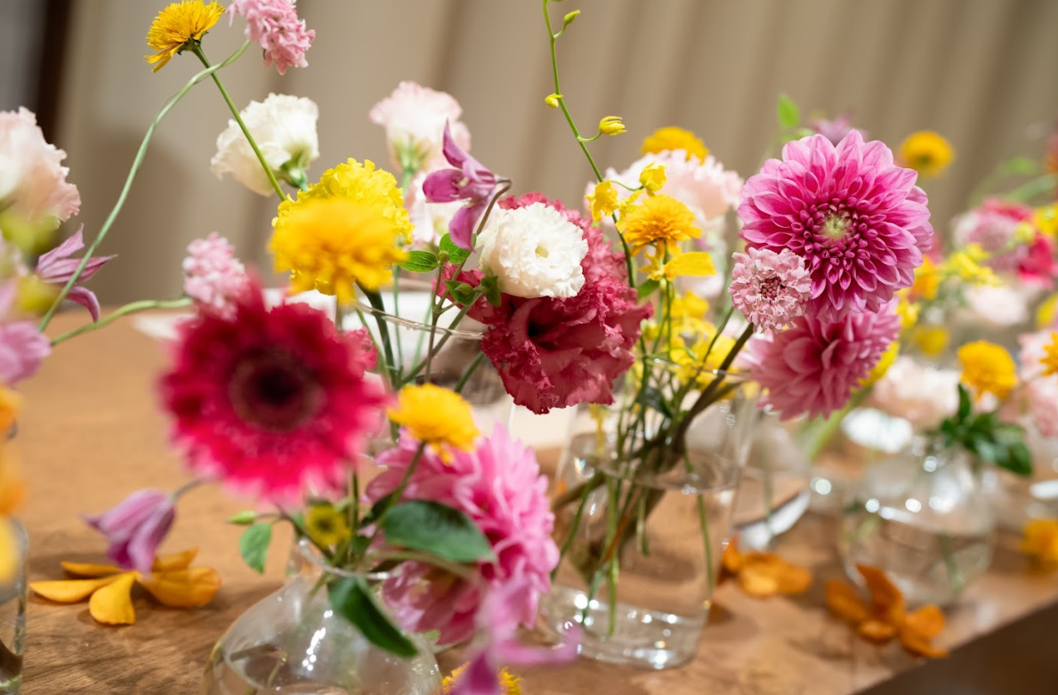 皆様にお持ちいただいたお花はゲストテーブルの花瓶に挿していただき