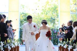 おふたりの未来が明るいものとなるよう、新郎新婦様に向かって舞う花びら