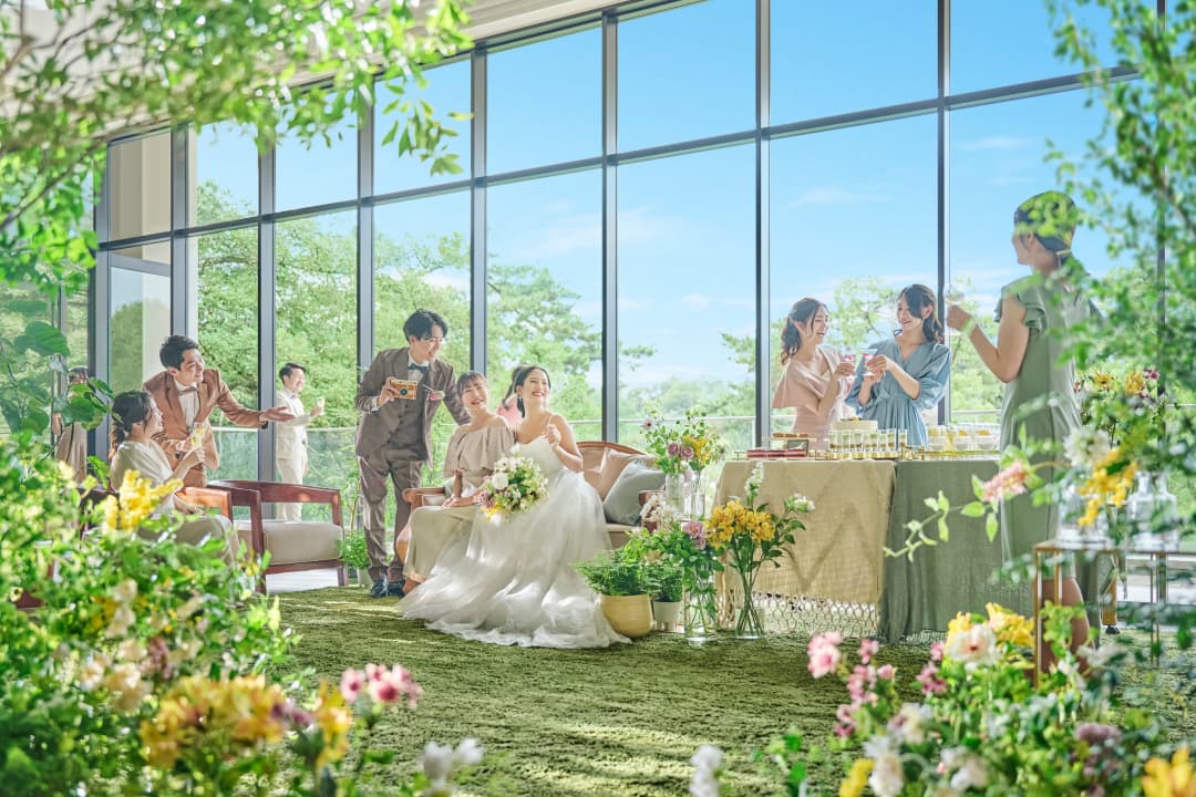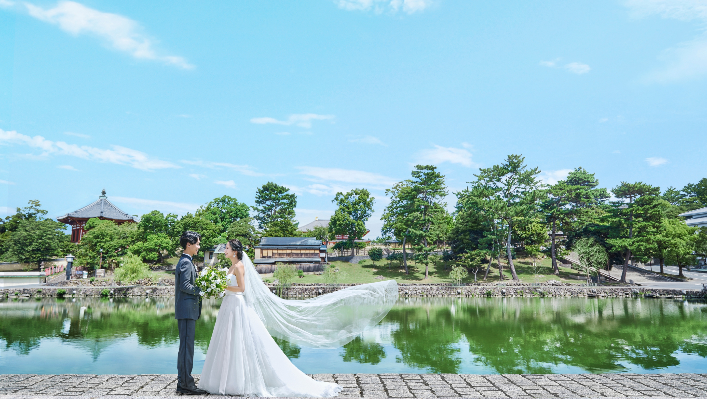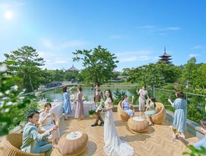 世界遺産・奈良公園の豊かな自然と、悠久の歴史を望む特別なロケーション。 大きな窓の先に広がる若草山や四季折々の景色が、 おふたりの誓いと祝宴を静かに、そして美しく彩ります。 伝統とモダンが調和した上質な空間で、大切なゲストと心を通わせる 記憶に残る一日をお過ごしください。