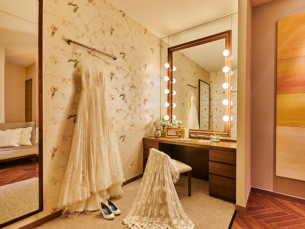 一生に一度、誰よりも美しく輝く日のお支度は、とっておきのプライベート空間で。ゆったりと設えた上品なインテリアが、当日の緊張を優しくほぐしてくれます。ご自宅で過ごすようにリラックスしてお過ごしください。