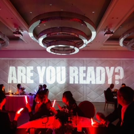 ドレス当てクイズでこれだと思う色のペンライトを持ってもらい、プロジェクションマッピングで楽しんでもらいました!