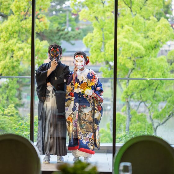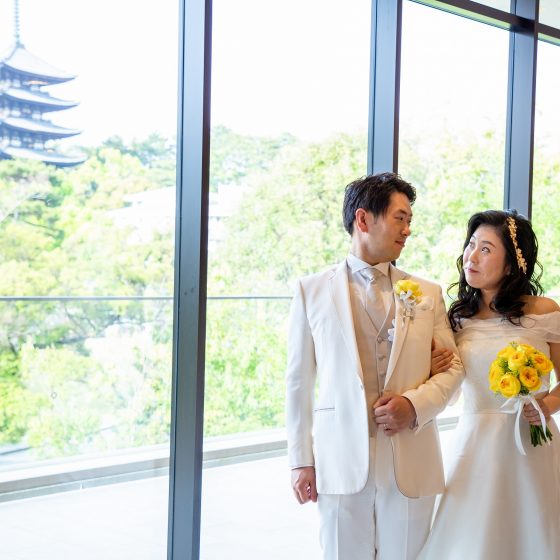 第一印象はチャペルの天井が高く、白色を基調とされていて明るく清潔感を感じる雰囲気と、披露宴会場の興福寺の五重塔が見えるロケーションはゲストの方々に奈良の良さを感じてもらいたいと考えていた私たちのイメージにもぴったりでした。