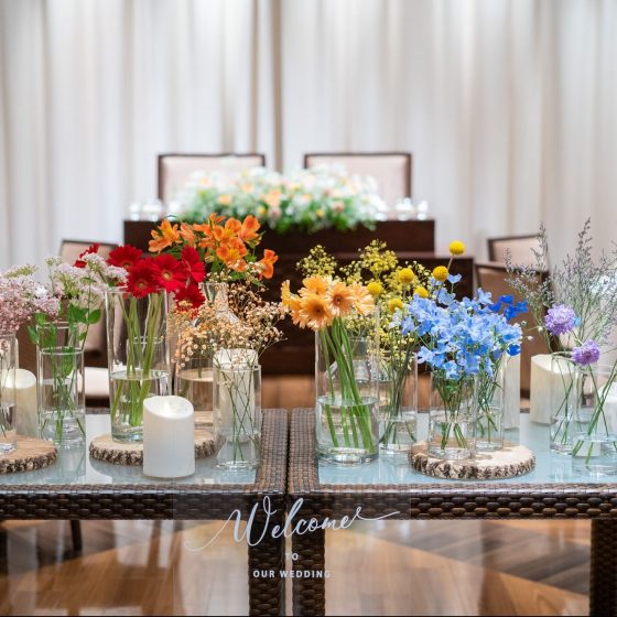 親族のみにすると決めてからは、各家族それぞれの持っている『色』を大切にしたいと思い『彩(いろどり)』という言葉をテーマに、カラフルで明るい結婚式を意識して会場作りの打ち合わせをして行きました。