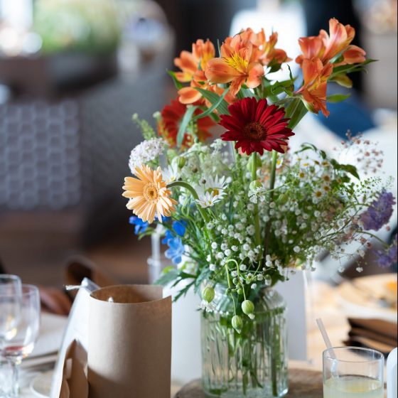 ゲストの方に1−2本好きなものを選んでいただき、各卓の真ん中の花瓶にいけていただきます。