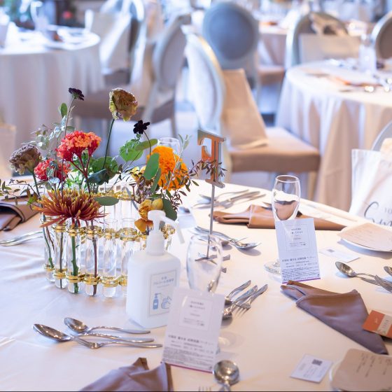 披露宴会場のテーブルの装花は、ゲストの方に入場時フラワービュッフェとして取ってもらい、試験管の花瓶にさしてもらう形にしました。
