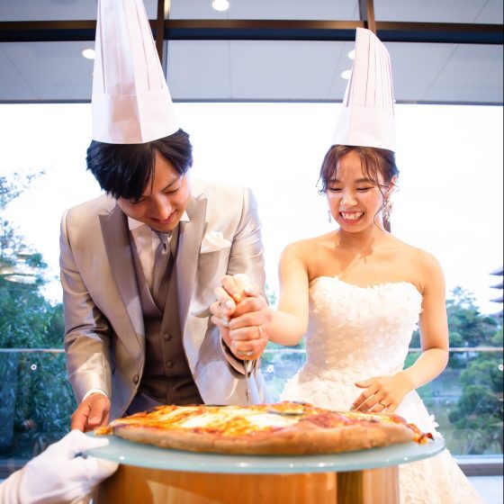 私たちの出会いのきっかけがイタリアンだったので、ウェディングケーキにはせずピザ入刀でファーストバイトを行いました。