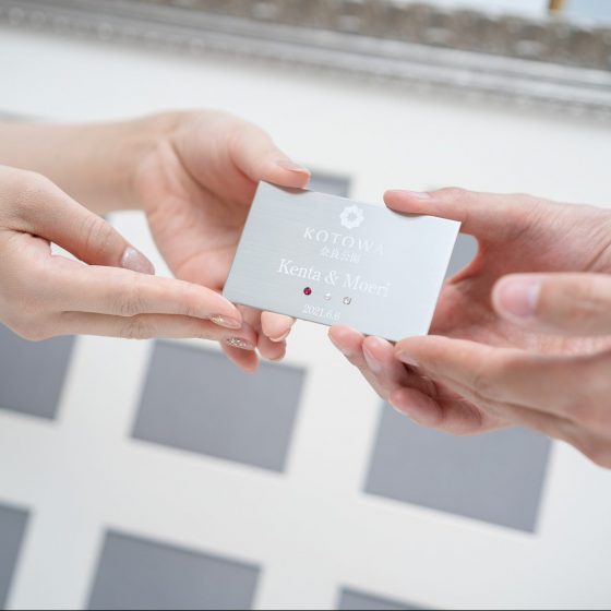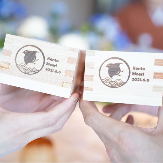 桝タワーの点灯後、日本酒での乾杯ができるように、ゲストの名前入りのオリジナル桝を席札がわりに使用するというアイデアも、プランナーさんと相談して叶えることができました。