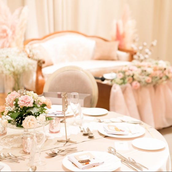 披露宴はゲストとの距離が近くて気軽に話せるような雰囲気にしたくて、高砂はソファー席に。
