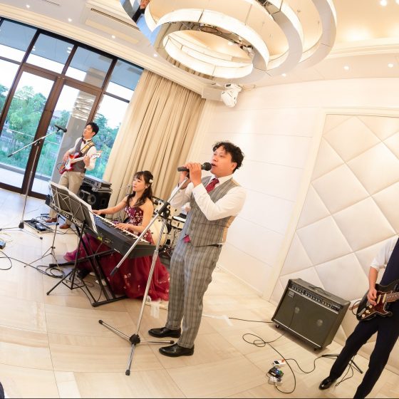 新郎が学生時代に軽音サークルでバンドをしていたことと、新婦が小さい頃からピアノを弾いていたことから、一緒にバンド演奏をすることに。