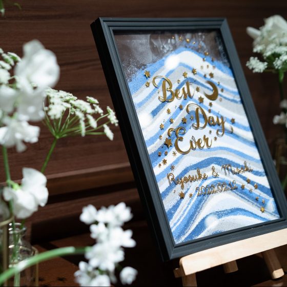 結婚証明書の一つとして、サンドセレモニーにて、家の列席者に「結婚生活で必要だと思うこと」をカラーサンドの中から選んでもらい、それを砂の層にして世界で一つだけの結婚証明書を作り上げました。