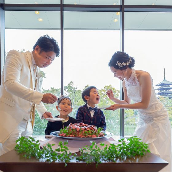 人とは被らない、思い出に残る式にしたいと考えてたので、日頃からお世話になっている従兄へのサプライズバースデーとセカンドバイトやゲストの方々の全員参加を考えて、式当日の様々な場面でお手伝いしていただいて印象に残る式にできたのではないかと思っています。