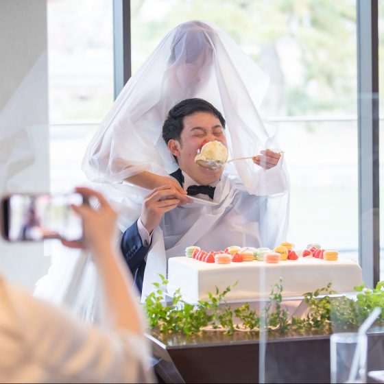 こちらも参加方で、マカロンをみんなで並べていきましょうという形にさせて頂きました。それぞれの個性が現れて家族一同わきあいあいと行うことができたウェディングケーキのイベントでした。二人羽織もとても楽しい雰囲気で行えました。