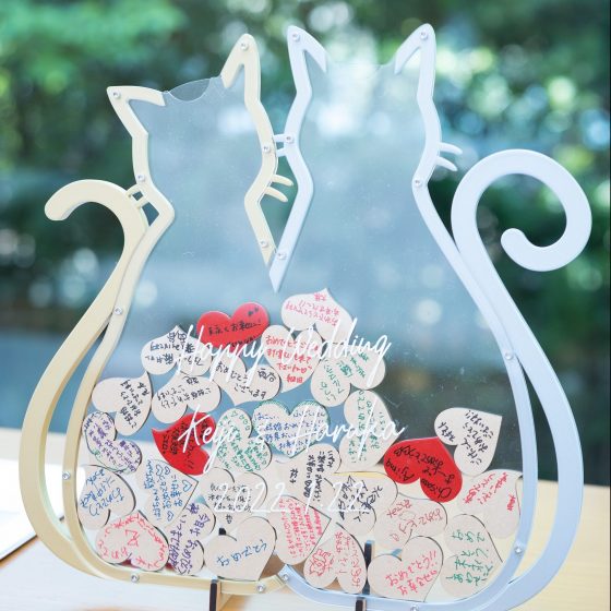 可愛い柄で全員デザインの違うフェイスガードもゲストに好評で用意してよかったです。受付そばの装飾スペースは披露宴で行う抽選クイズのためと、連れてこれなかった分家族の一員である愛猫をゲストに紹介するスペースにしたくて用意しました。