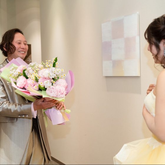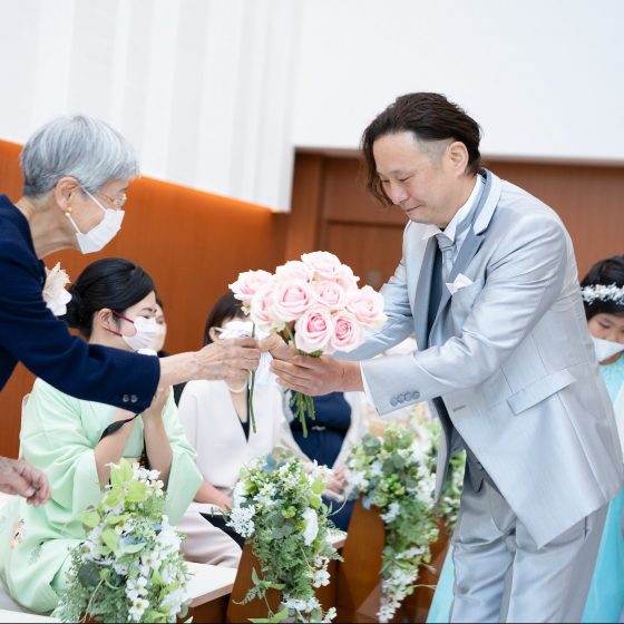 会場装花にもブーケにも無事使うことができ、母も喜んでくれたかなと満足しています。旦那さんは亡くなられたお義父さんのカフスとネクタイピンをお色直しで着用しました。きっと喜んでくれたと思います。