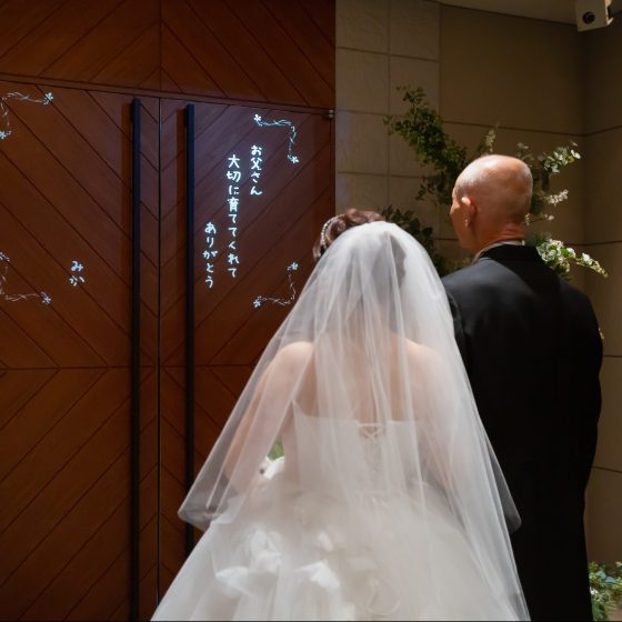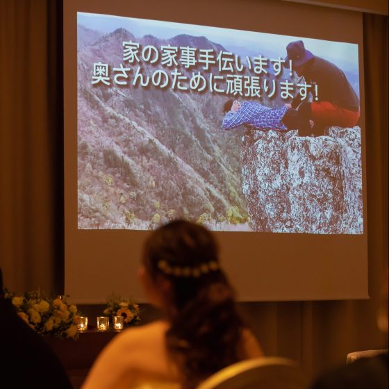 まず、登場する時にテラスという以外な所から登場し、お色直しの後の再登場は、プロジェクションマッピングから登場しました。再入場後は、キャンドルサービスとして、キャンドルオリュージョンを使い、サプライズの演出を行いました。