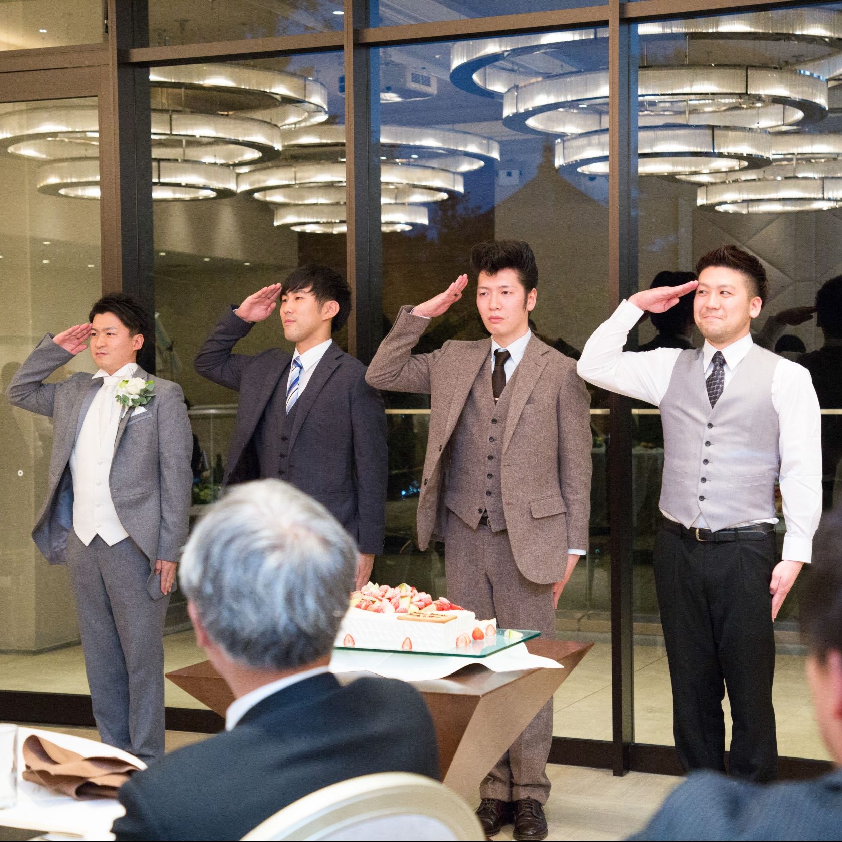 地元で所属している消防団の友達と行進しながら退場した新郎。