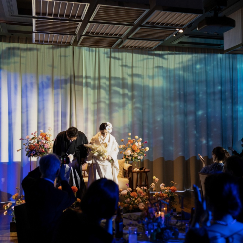 暁の落ち着いた和の雰囲気にも合うように、且つ華やかな雰囲気も出したいと、花の色味やイメージを、フローリストさんとしっかりと相談していきました。当日は、私たちがイメージしていた以上に素敵な空間になっていて、可愛い!と驚きでした。