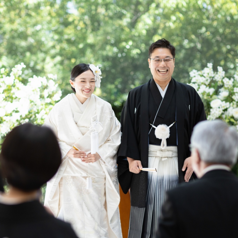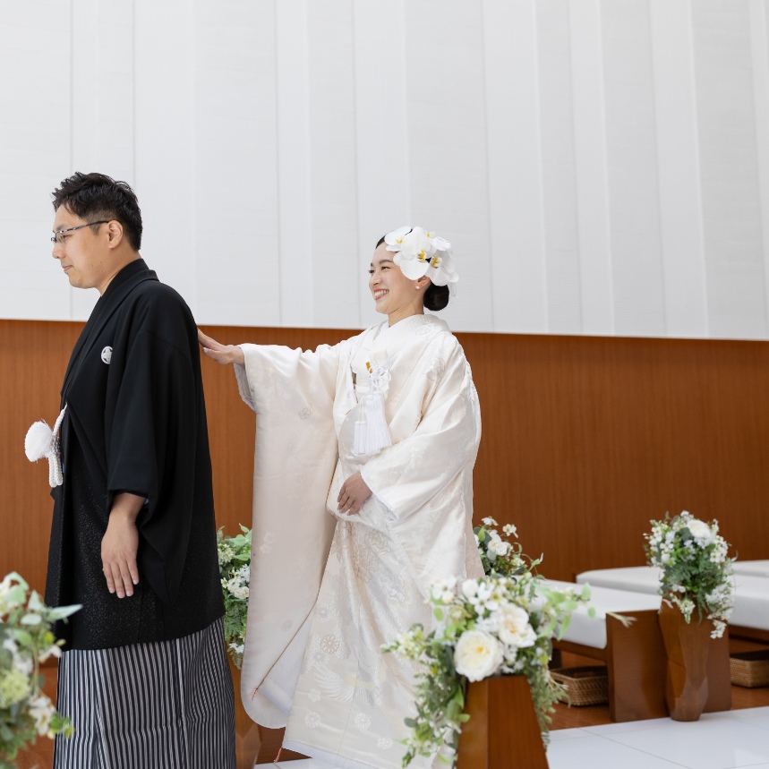 和装でしたいという二人の意見で、チャペルで人前式にしました。みんなの方を向いて誓い、証人になってもらうというのがとても良かったなと思います。