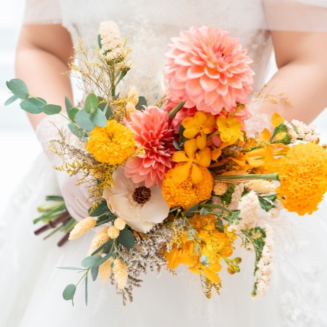 ドレスやお花、ウェルカムスペースの小物類の色味もテラコッタやオレンジ系で統一し