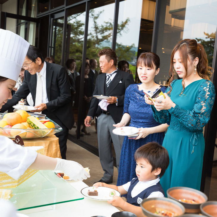 式当日の氷彫刻運搬では気温が高いこともあり、溶けてしまわないか心配しましたが厨房の冷蔵庫をお借りしてキンキンに冷やして頂いたため、無事展示することができましたし、デザートビュッフェで新郎新婦がかき氷をみなさんにふるまう場面では私たちだけでは手が足りませんでしたが、田中さんにお手伝い頂いたおかげで無事全員に配ることができました。