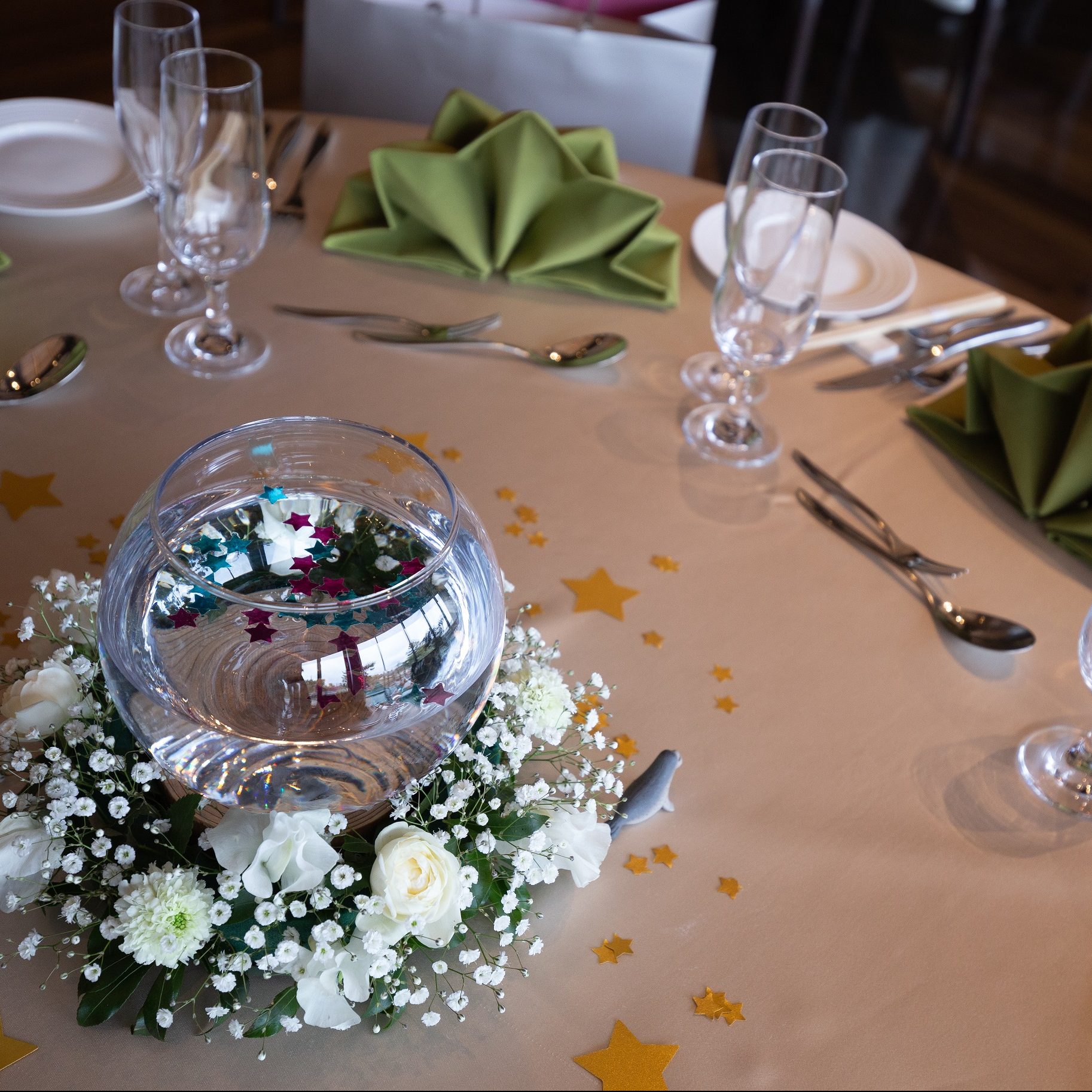 ゲストの願いを叶える演出をプランナーさんから提案して頂きました。招待状に願い事を書く欄を設け、皆さんの願いを星のガーランドにして飾りつけました。演出としては当日クジで引いて、当たった方の願いを叶えることができました。