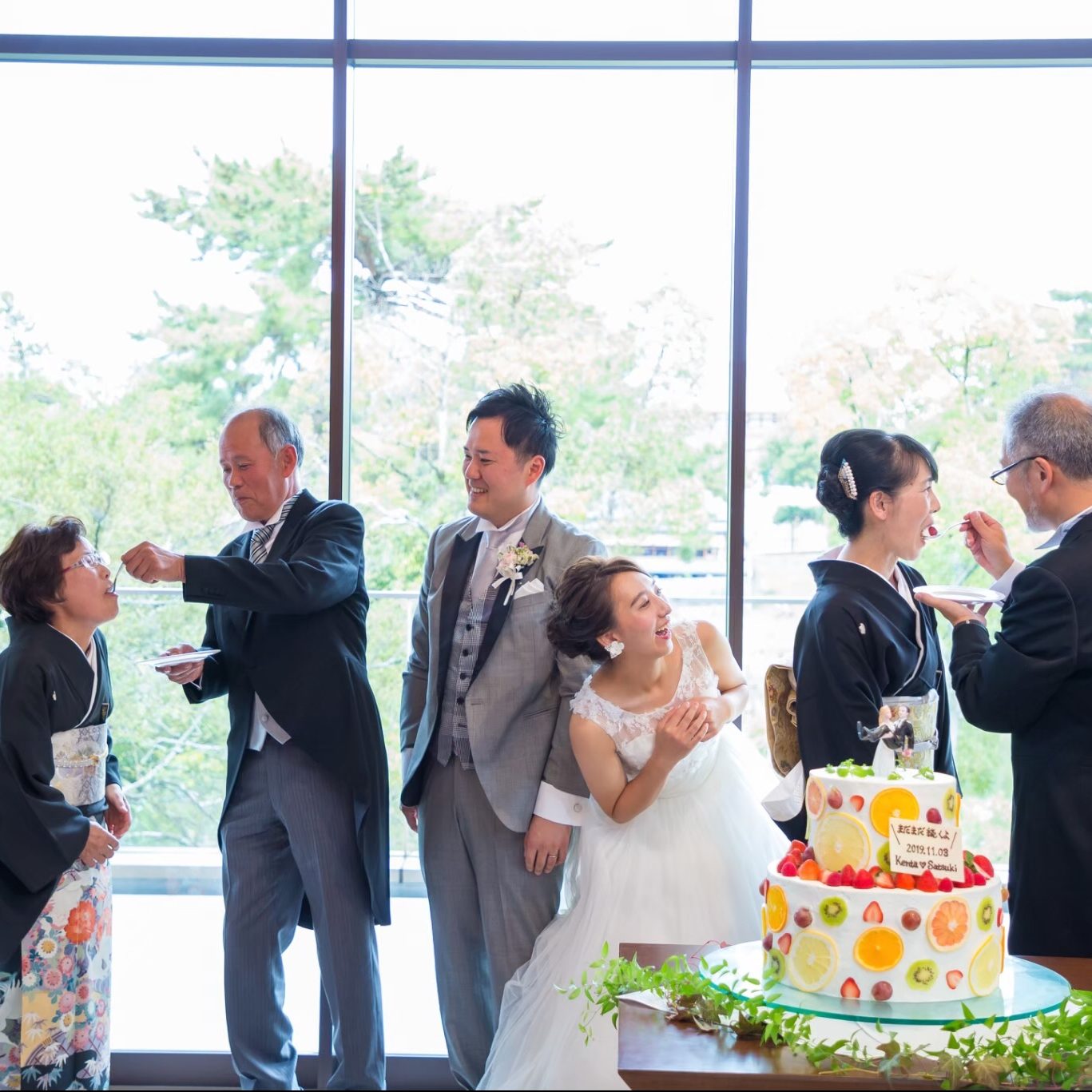 ウエディングケーキ入刀の際の両親によるお手本バイトや、お色直しの際の兄弟での中座は家族への感謝を表したものです。
