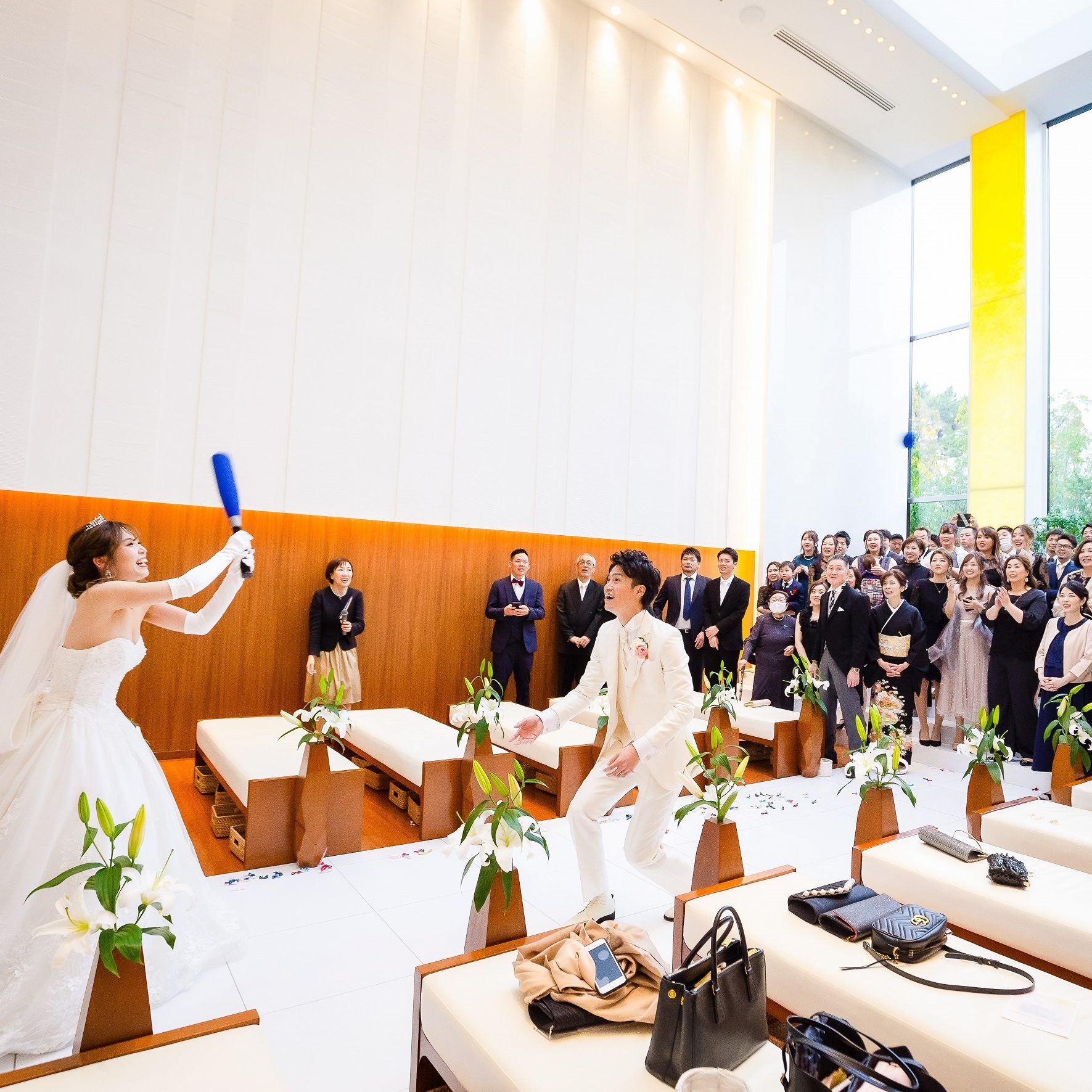 野球、釣りが好きなので、ブーケトスを野球バージョンでしたり、フードファイターを釣りでしたり。