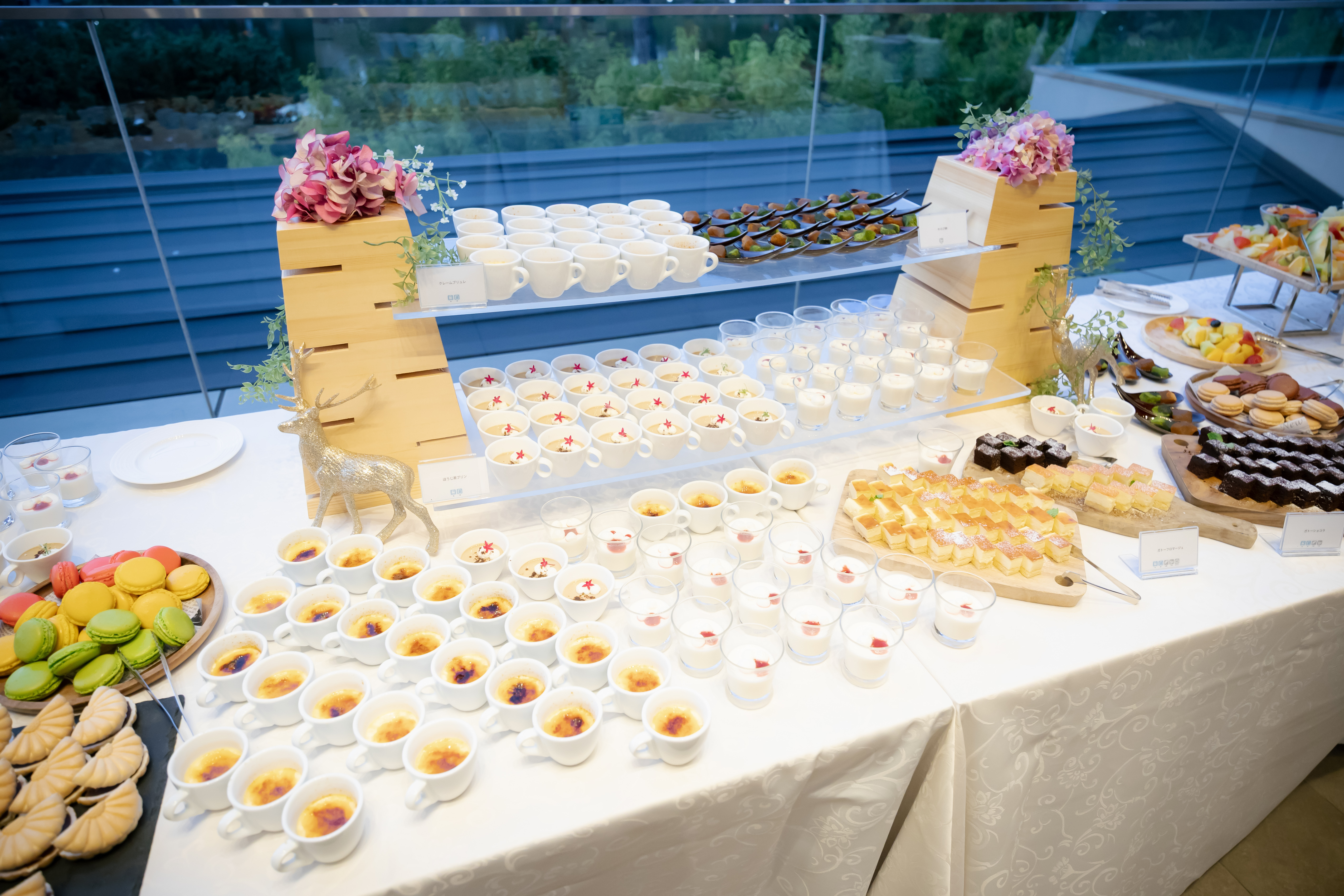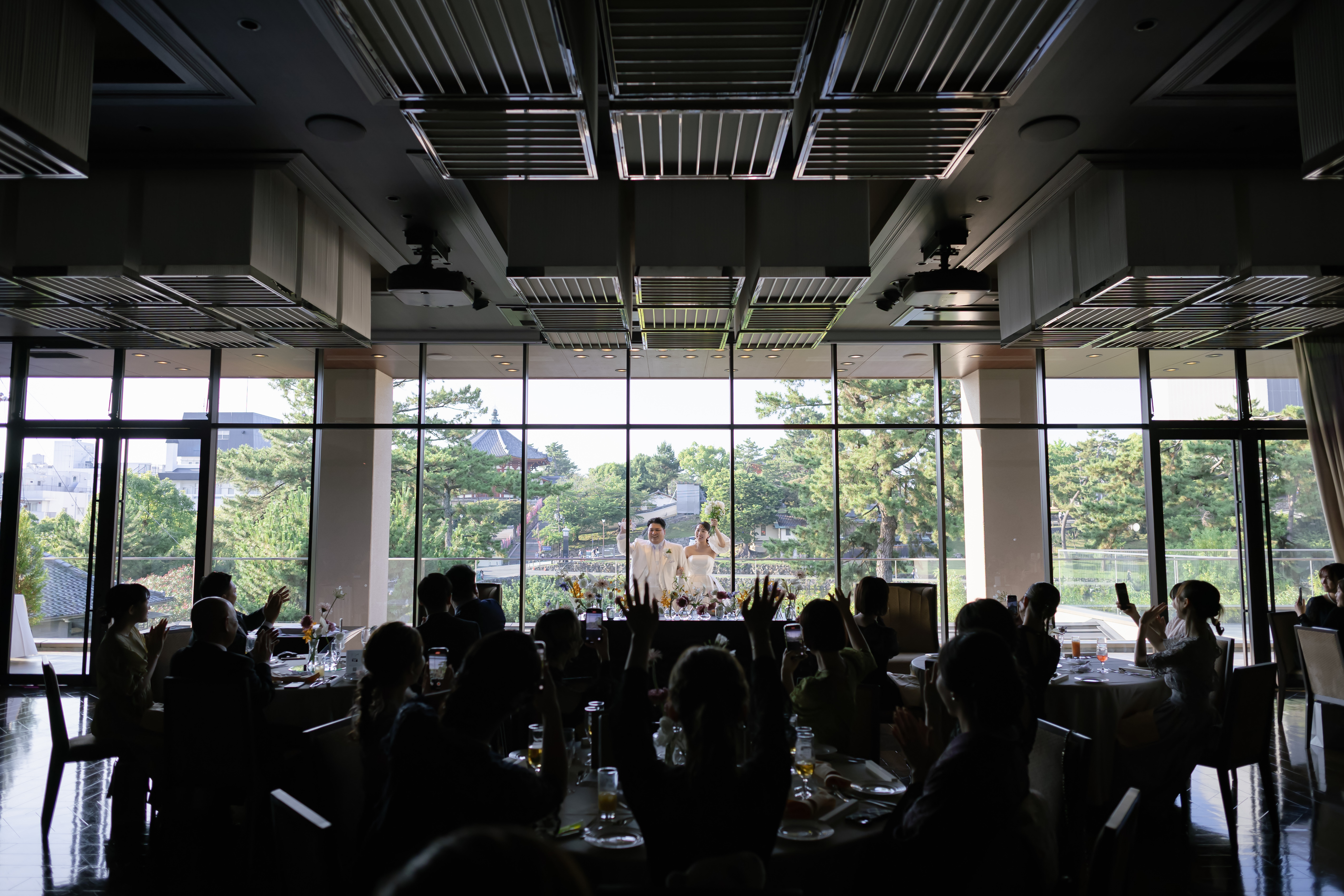 おふたりこだわりのデザートブッフェは、猿沢池や興福寺を望めるテラスにご準備。会場のカーテンが勢いよくオープンすると、奈良らしい景色と共に、色とりどりのスイーツが並ぶ華やかな空間が出現しました。思わぬサプライズ演出にゲストからは大きな歓声が上がりました。単にお菓子を振る舞うだけでなく、ゲストが自由に席を立ち、会話を弾ませながら笑顔で過ごす時間は、おふたりが望んでいた「緊張感のない温かな空間」そのものでした 。