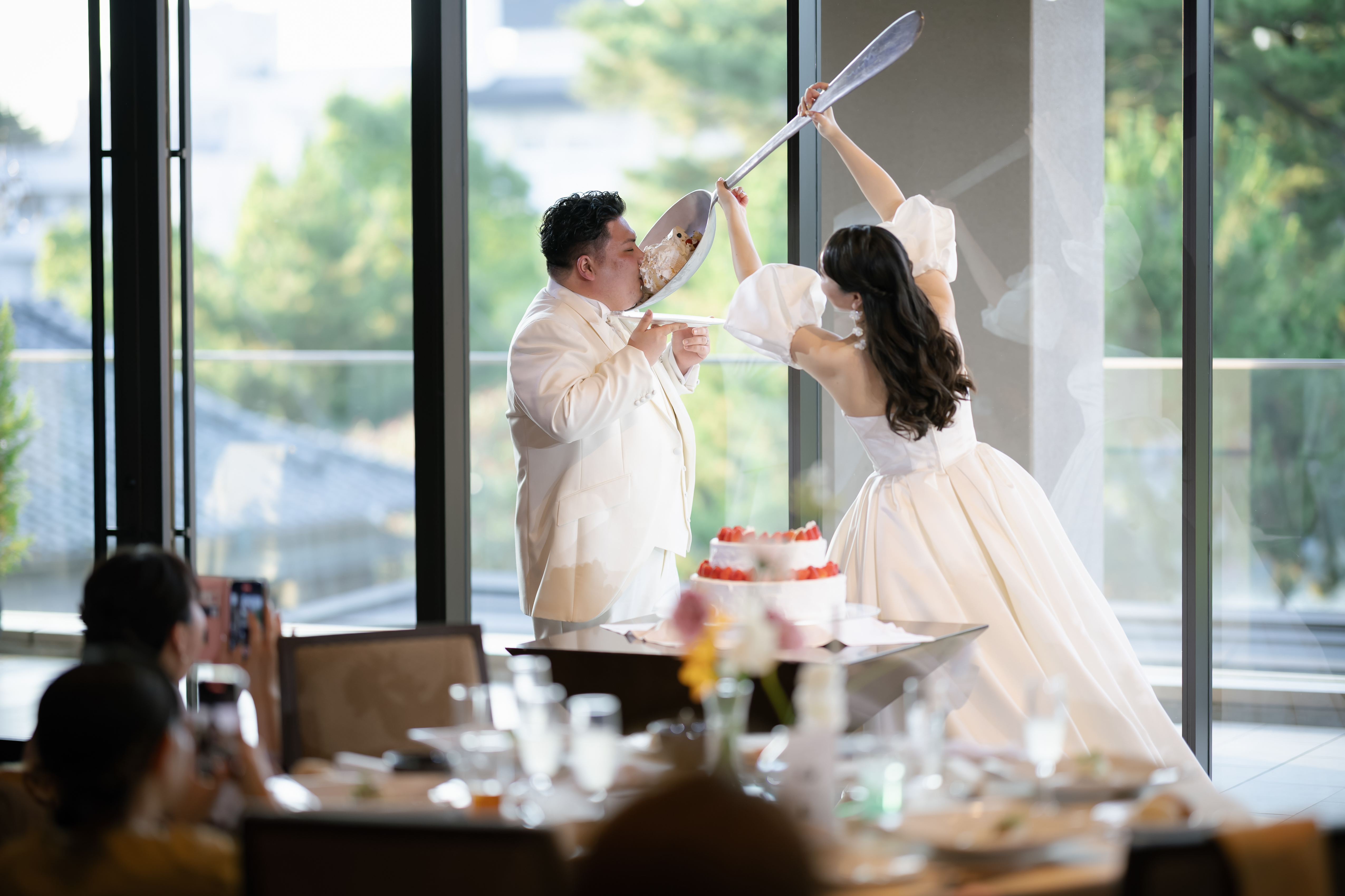 そしてもう1つ、おふたりが大切にされていたのがおふたりらしいウェディングにすること。作戦会議のように楽しく話し合う中で見つかった答えが「壮宥さん、風香さんらしいユーモアで会場を笑顔に包むこと」でした。その想いがまさに形となったのが特大スプーンでのファーストバイト。お打合せでは、スプーンが登場する瞬間のBGMやスタッフの動きまで、「どうすれば一番盛り上がるか」を考え、ユーモアを具体的な「演出」へと形作っていきました。