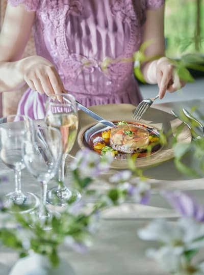 ラウンジやテラスを使ったカジュアルな空間で、少人数ウエディングにふさわしい時間をお過ごしください。ホームパーティーのような感覚で緊張が和らぎ、自然体でゲストとの会話を楽しめます。 お料理は、 地元の旬の食材を生かした”フレンチジャポネ”を、お食事の進み具合に合わせ、最も美味しい状態でお料理をご提供します。 完全バリアフリーにも対応しておりますので、お子さま連れやご年配のゲストにも安心してお過ごしいただけます。