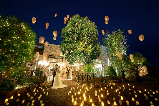 緑あふれるガーデンも開放的なラウンジも、1軒屋丸ごと貸切だからこそ、おふたりらしさを存分に表現した演出が可能です。ゆっくりと昇っていくランタンが夜空いっぱいに広がるスカイランタンの演出は幻想的な光景で人気の演出のひとつ。