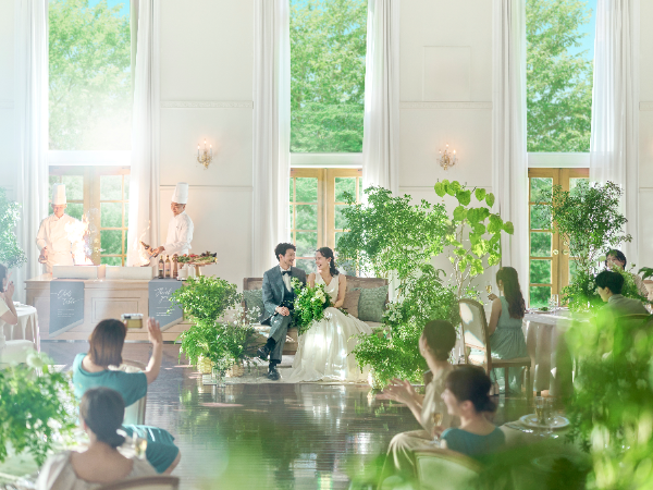 最大150名のゲストをお招きできる広々としたバンケットは、天井も高く開放的な空間。大人数はもちろん少人数の場合は、会場の一角にフォトブースやキッズスペースを設けるなど、空間を贅沢に使ったレイアウトが可能です。広さを活かした自由なアレンジで、ゲストにとっても居心地の良い、おふたりらしいパーティーを形にしてください。