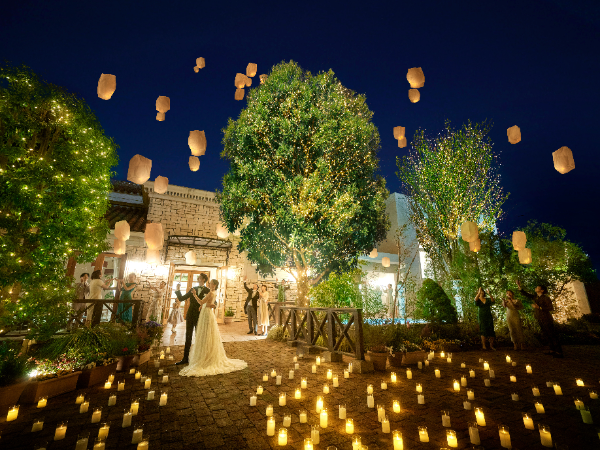 緑あふれるガーデンも開放的なラウンジも、1軒屋丸ごと貸切だからこそ、おふたりらしさを存分に表現した演出が可能です。ゆっくりと昇っていくランタンが夜空いっぱいに広がるスカイランタンの演出は幻想的な光景で人気の演出のひとつ。