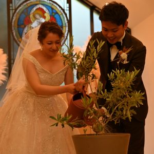挙式前にゲストの方に土を入れていただいたオリーブの木。