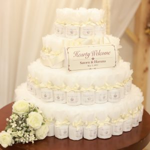 こちらはプチギフトをウェディングケーキ型に並べて、