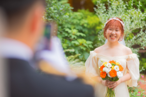 ガーデンの緑とナチュラルな印象のドレスがとてもお似合いです。