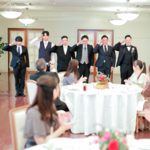 新郎様は苦楽を共にした仲間たちと列車を作って仲良くご中座♪