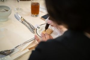 音楽の合図と同時にチョコペンで指定の文字をクッキーへ