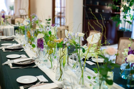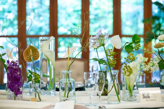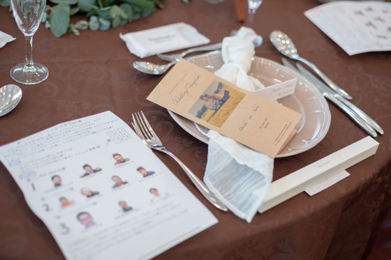 テーブルクロスやナフキンのお色味、ペーパーアイテムやお花など、