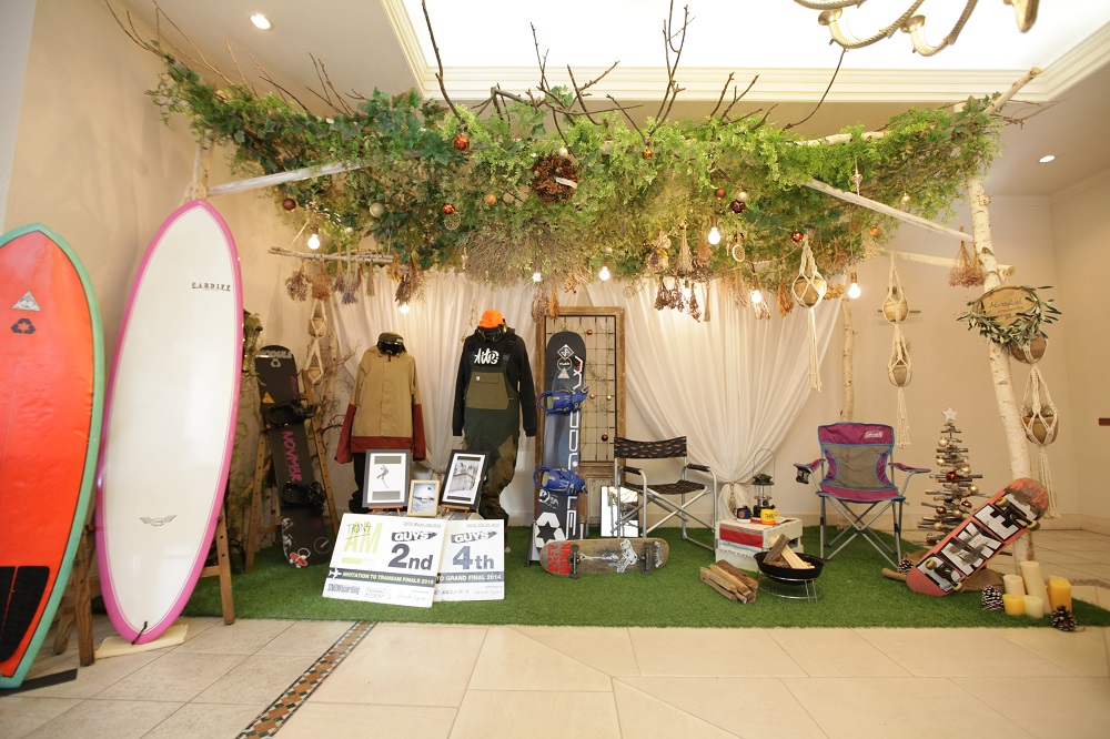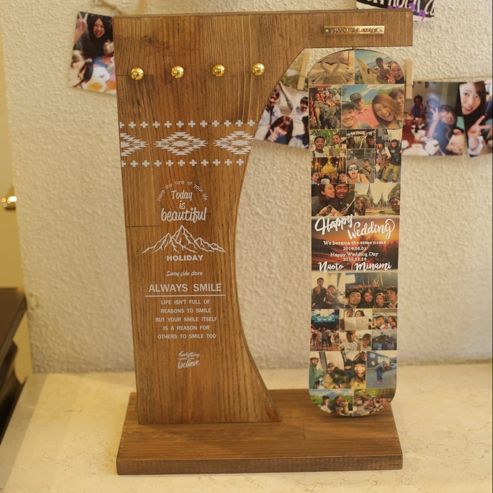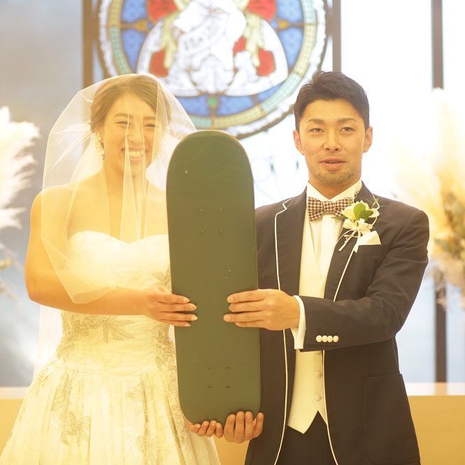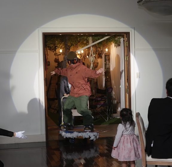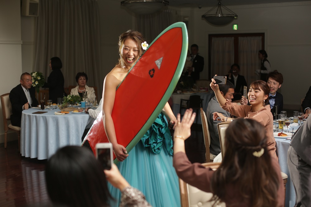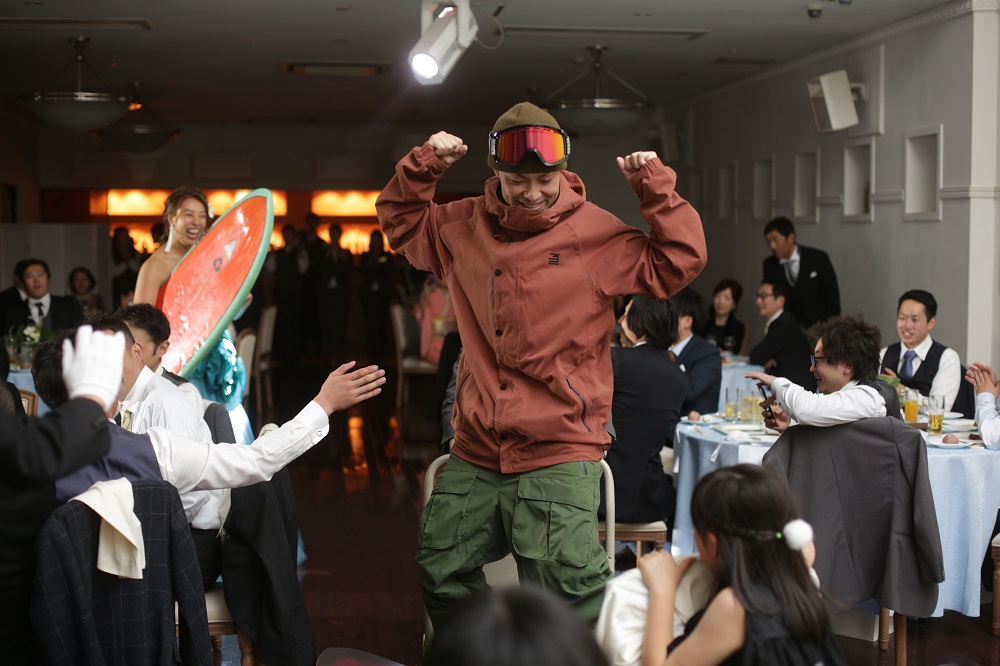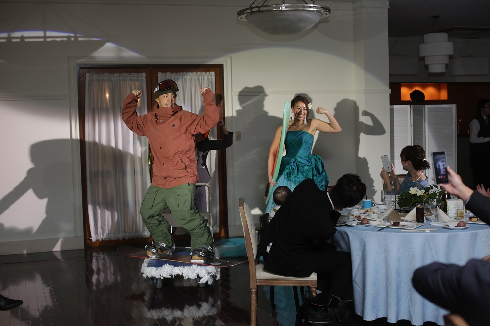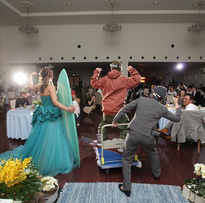 ご新郎様はスノボウェアを全身に身にまとい、ご新婦様はサーフィンボードを担いで登場!
