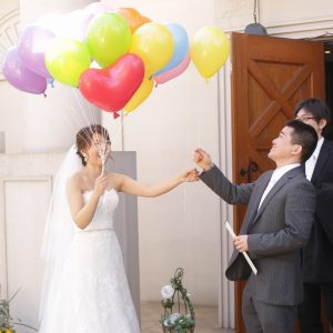 挙式のあとにおふたりとゲストが一斉に空に向かって風船を飛ばす