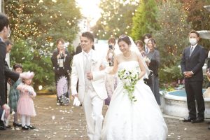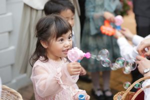 ガーデンに出てくる際にフラワーシャワーと、お子様にシャボン玉シャワーをやっていただきました!