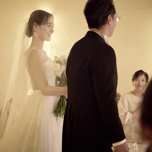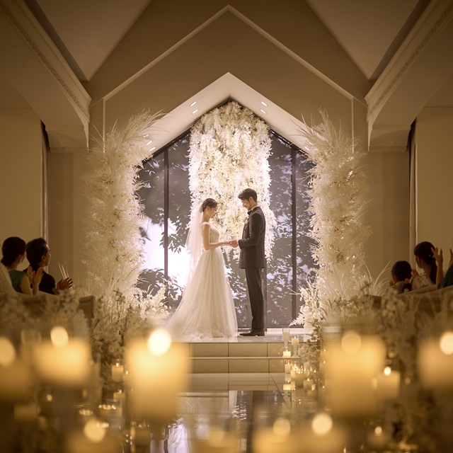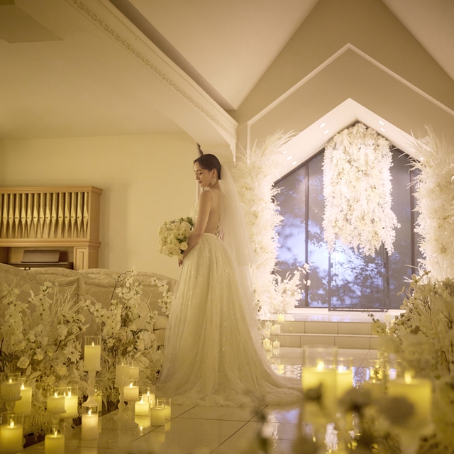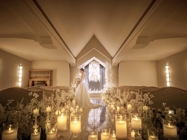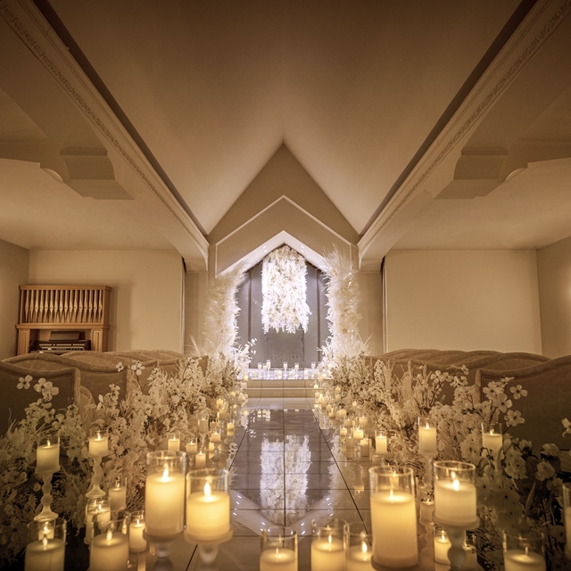 真っ白なチャペルでは、照明を落とし光をあえて抑え、キャンドルをコーディネートすることで、幻想的な空間の演出も可能です。100本以上のキャンドルに包まれた厳かな雰囲気の中、おふたりが紡ぐ一生の誓いは、ゲストとおふたりの心に深く刻まれることでしょう。
