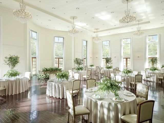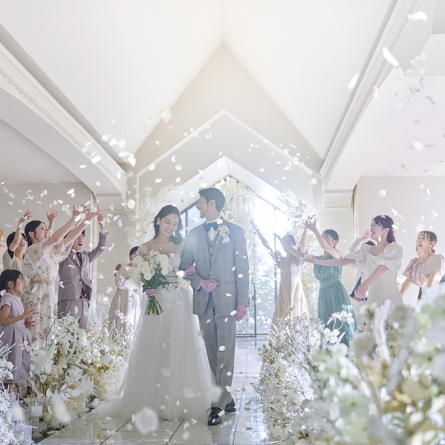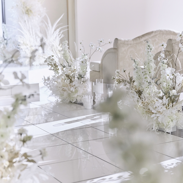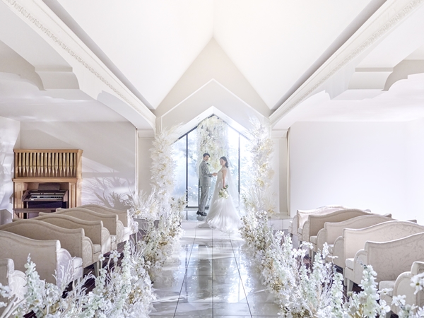 内装リニューアルにより、より印象的な純白の空間に生まれ変わった独立型チャペル。 柔らかな光に導かれながら、おふたりはバージンロードを歩み、永遠の愛を誓います。その姿を見守る参列席は、ゆったりと座れるソファ仕様。祭壇との距離が近いため、おふたりのいつにない緊張もあふれだす喜びも手に取るように伝わり、チャペル中の誰もが幸せな気持ちで満たされます。
