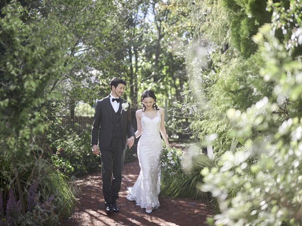 入口から続くレンガの小径を抜けると、可憐な花や木々に囲まれたプライベートガーデンが広がります。ガゼボや噴水、イルミネーションなど、絵になるロケーションにゲストの期待も高ります。