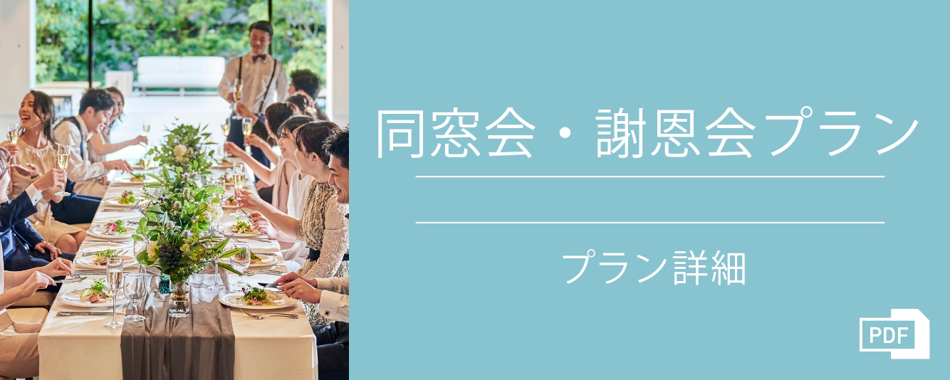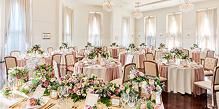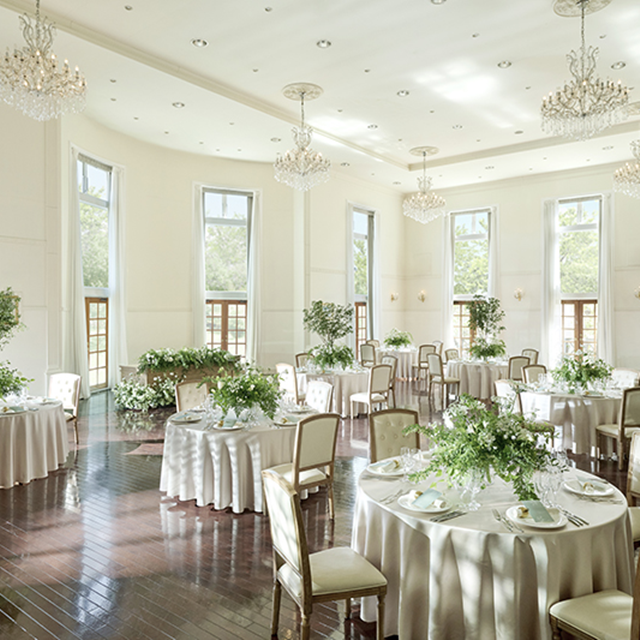 アイボリーカラーを基調とした、明るく優しい雰囲気のパーティー会場。緑豊かなガーデンを使った自由な演出も魅力のひとつです。最大150名が入る広々とした空間は、パーティーのテーマや人数に合わせて自由なレイアウトをお愉しみいただけます。ご宴会はもちろん、会議や展示会などのビジネスシーンにも幅広くご活用ください。