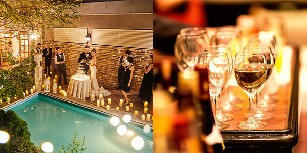 館内には、最大150名まで収容可能な広々としたパーティー会場があり、隣接するウッドデッキテラスやガーデンにも自由に行き来できるのが魅力です。また、受付として使えるラウンジや控室にできる個室など、快適にお過ごしいただける空間もご用意。その他、映像上映やバーカウンターでのドリンクサーブなど、パーティーシーンを盛り上げる多彩な演出に対応できます。